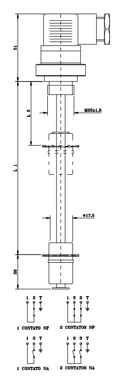 A chave controladora de nível NSA M NA/NF250 é um dispositivo projetado para monitorar e controlar o nível de líquidos em reservatórios sem pressão, garantindo acionamento confiável em sistemas de lubrificação. Seu funcionamento ocorre por meio de um flutuador magnético que aciona o contato reed interno, permitindo a sinalização óptica ou acústica para ligar ou desligar bombas, alarmes ou controlar o abastecimento.