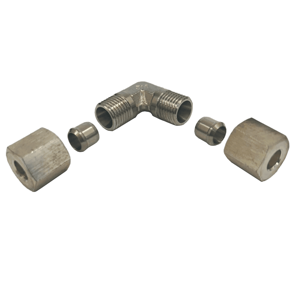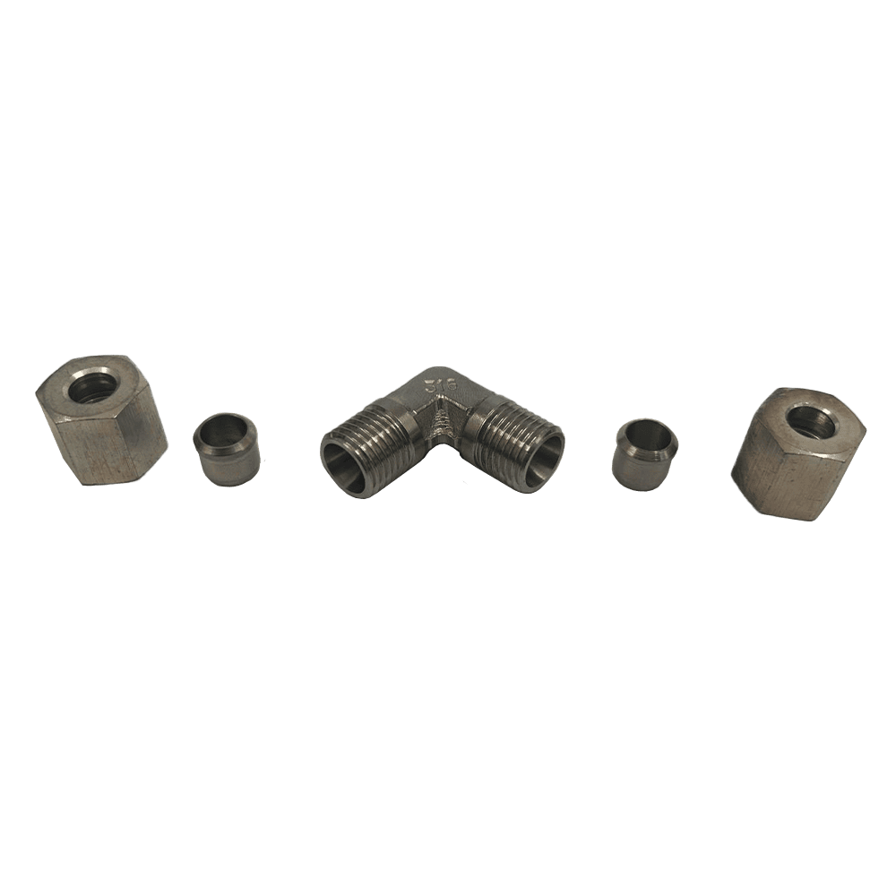 O Joelho Igual de Inox 316 JII é uma conexão a 90° utilizada para unir tubos de mesmo diâmetro, permitindo mudanças de direção em linhas de lubrificação, hidráulicas e de instrumentação industrial. Fabricado conforme as normas DIN 2353 e ISO 8434-1, também conhecidas como padrão Ermeto, garante vedação metálica confiável e montagem precisa.