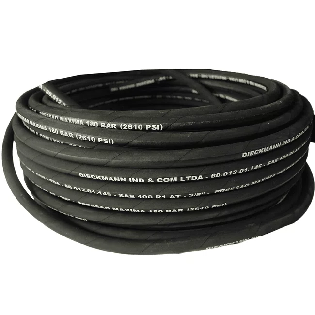 Mangueira hidráulica fabricada conforme padrão SAE 100 R1 AT / EN 853 1SN, projetada para aplicações de baixa a média pressão em sistemas hidráulicos industriais e móveis. Ideal para uso em máquinas-ferramentas, equipamentos agrícolas e circuitos hidráulicos que operam com fluidos à base de petróleo ou água.