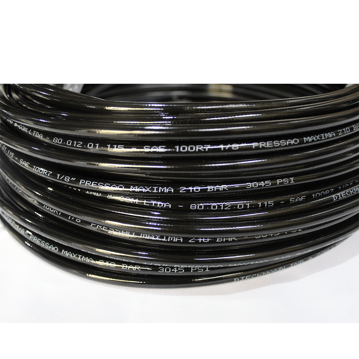 Composta por tubo interno em Nylon 11, reforço intermediário com malha de poliéster de alta resistência e cobertura externa em poliuretano, a mangueira oferece flexibilidade, resistência à abrasão e compatibilidade com lubrificantes.