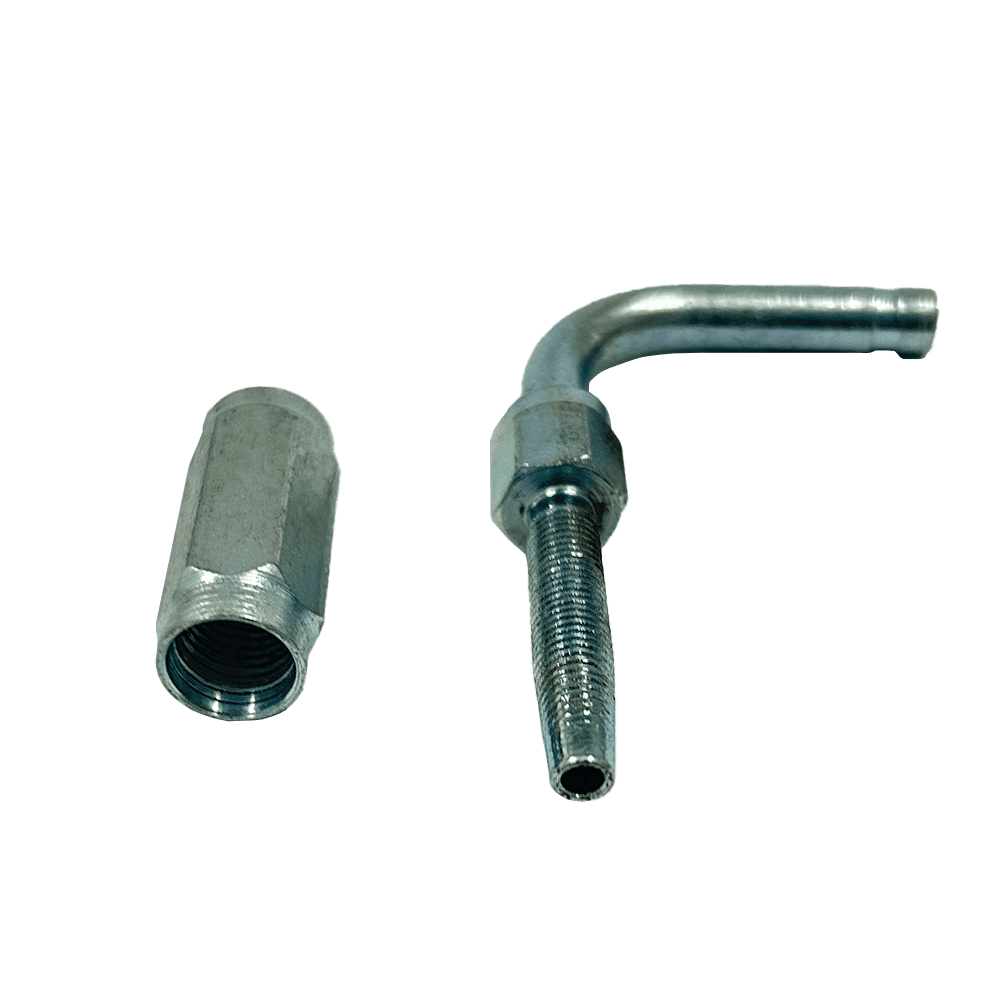O Terminal Reusável 90 Graus em Aço Carbono é utilizado em mangueiras termoplásticas para sistemas de lubrificação, permitindo conexões seguras e montagem em ângulo para facilitar o roteamento da linha em espaços restritos.